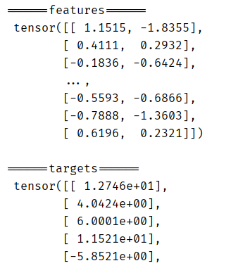 1 2 3 4 5 6 7 8 9 10 11 12 13 14 15 16 17 def synthetic_data (w, b, num_examples ): """合成数据,生成 y = Xw + b + 噪声。""" X = torch.normal(0 , 1 , (num_examples, len (w))) y = torch.matmul(X, w) + b y += torch.normal(0 , 0.01 , y.shape) return X, y.reshape(-1 , 1 ) true_w = torch.tensor([2 , -3.4 ]) true_b = 4.2 features, targets = synthetic_data(true_w, true_b, 1000 )print ('\n======features======\n' , features)print ('\n======targets======\n' , targets)