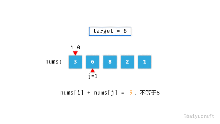 最容易想到的解法,从头枚举数组中的每一个数x,如果target - x在该数后面的数组中,则返回两个数的下标: