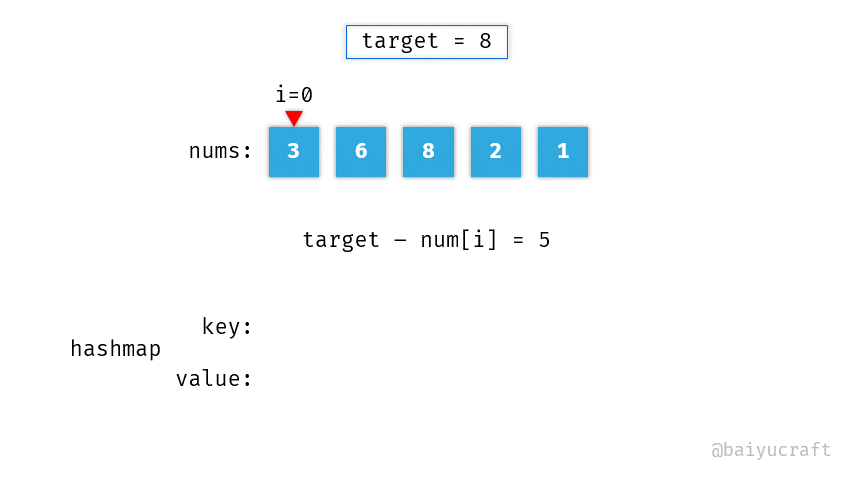 思路: 遍历时,计算target - num的值,如果该值不是hashmap的键,就创建一个名为num的键,并且值为其在列表中的下标;如果target - num的值是hashmap的键,则找到了这样的一组数,返回对应数组下标